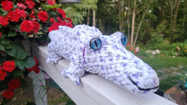 23" long and super soft and cuddly! White, lilac and grey Alligator complete with a collar so he can be walked!