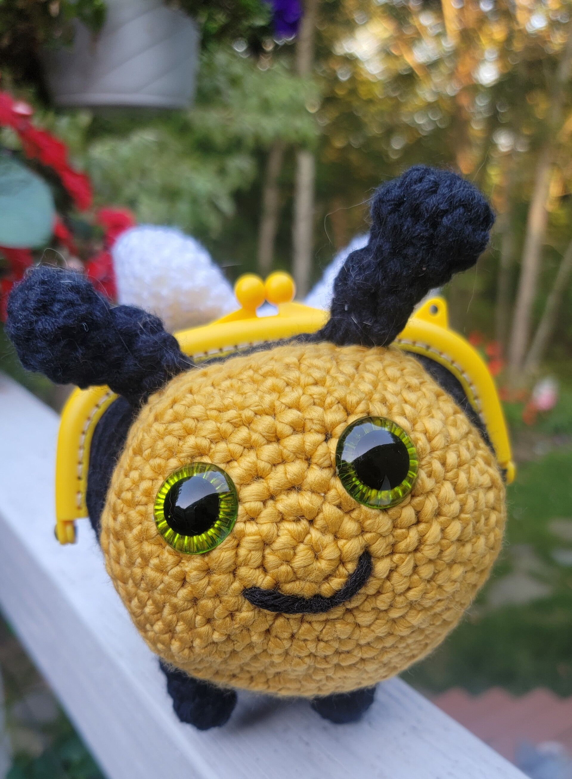 Bee handbag with a yellow clasp in the middle of the bag. Lined in, what else, flower patterned material withhummingbirds. Green sparkly safety eyes and a big smile! He's bee-tastic! 9.5" long including his stinger and 14" circumference