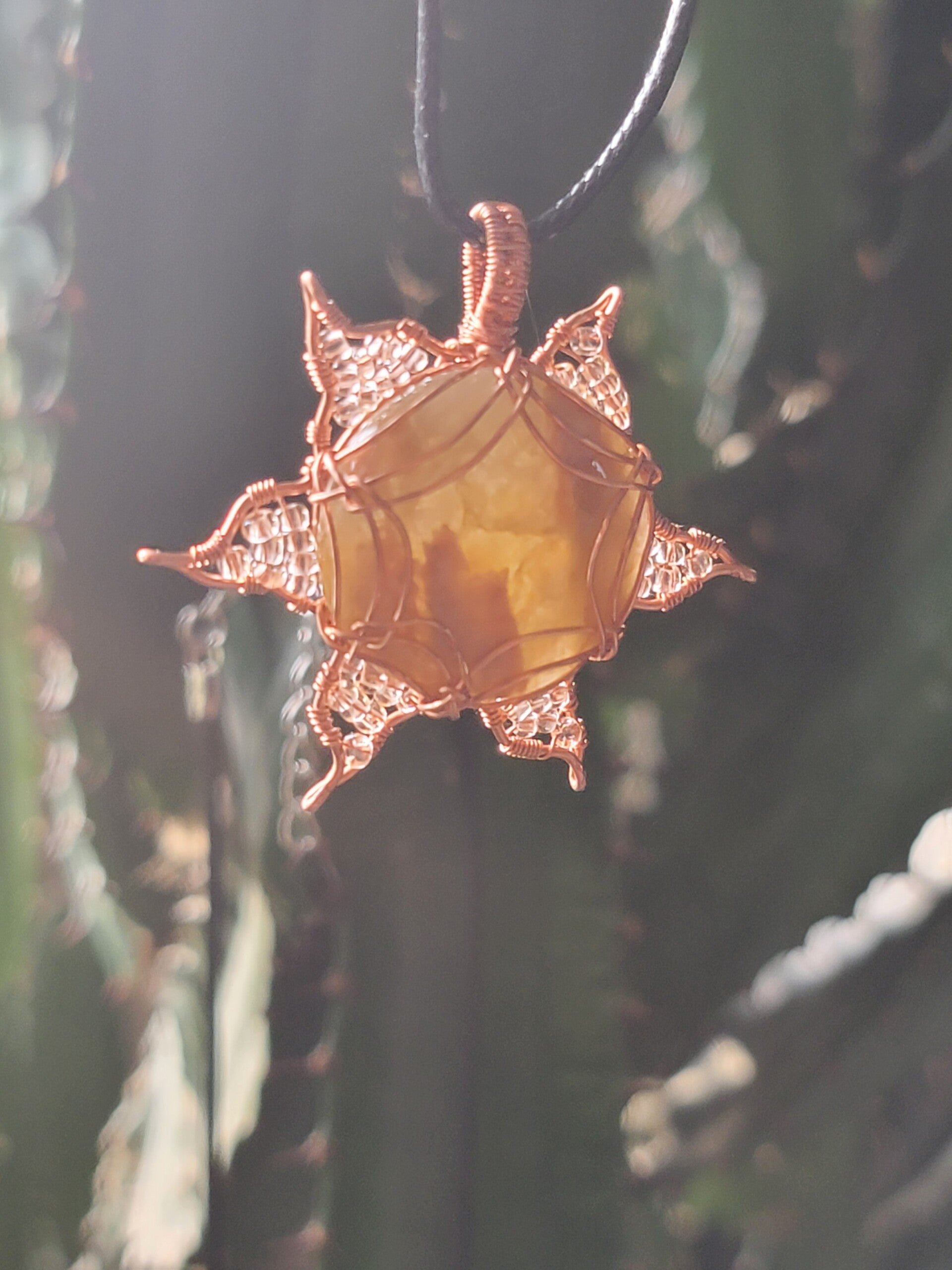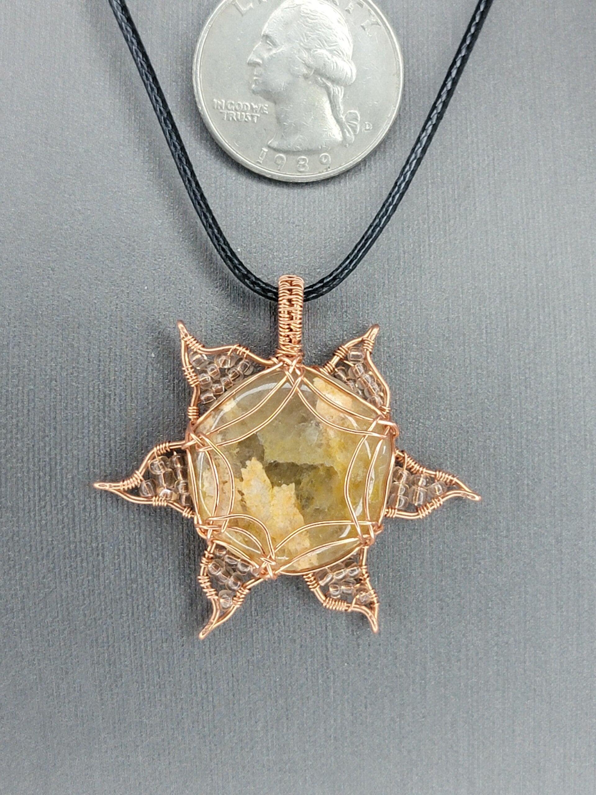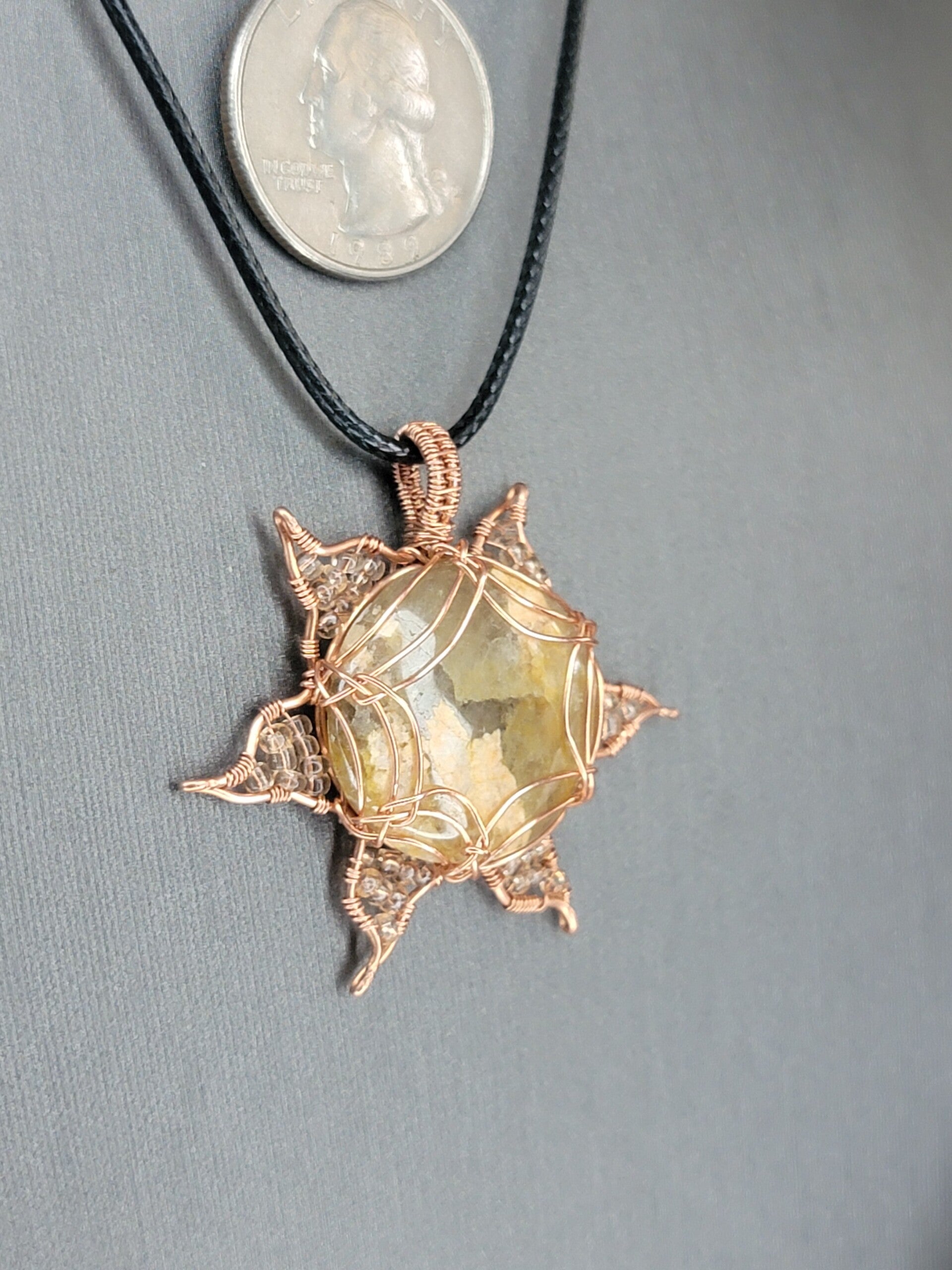 Pendant & Necklace, Rhodonite Agate Sun Cabochon, wrapped in copper w/glass beads.