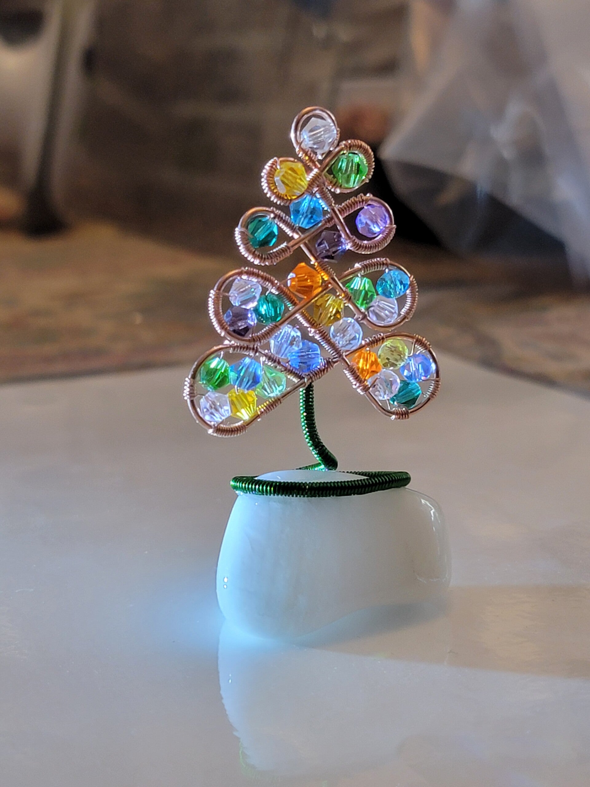 Christmas Tree, wire wrapped copper and Zircon beads and Quartzite base.