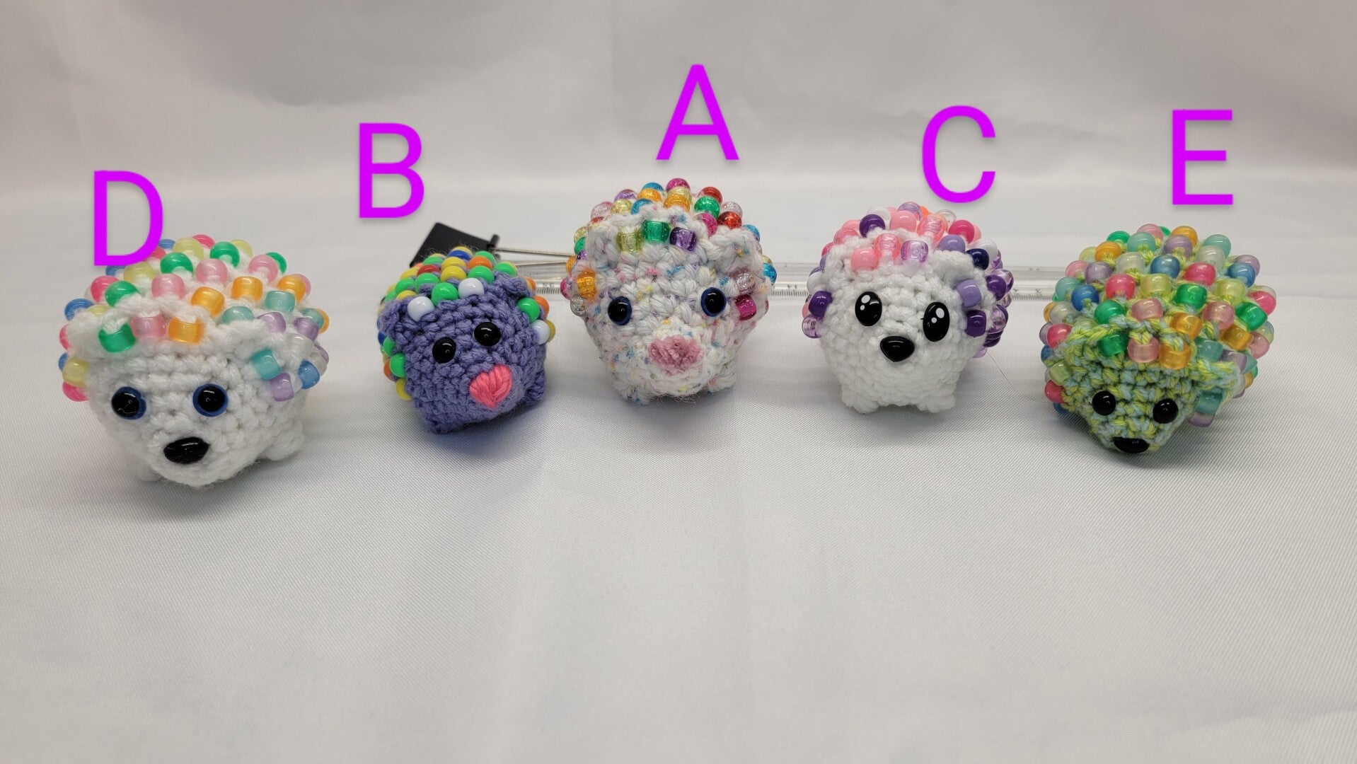 Fidget hedgehogs. Approximately 5" long and 3" tall. D and E have glow in the dark beads.