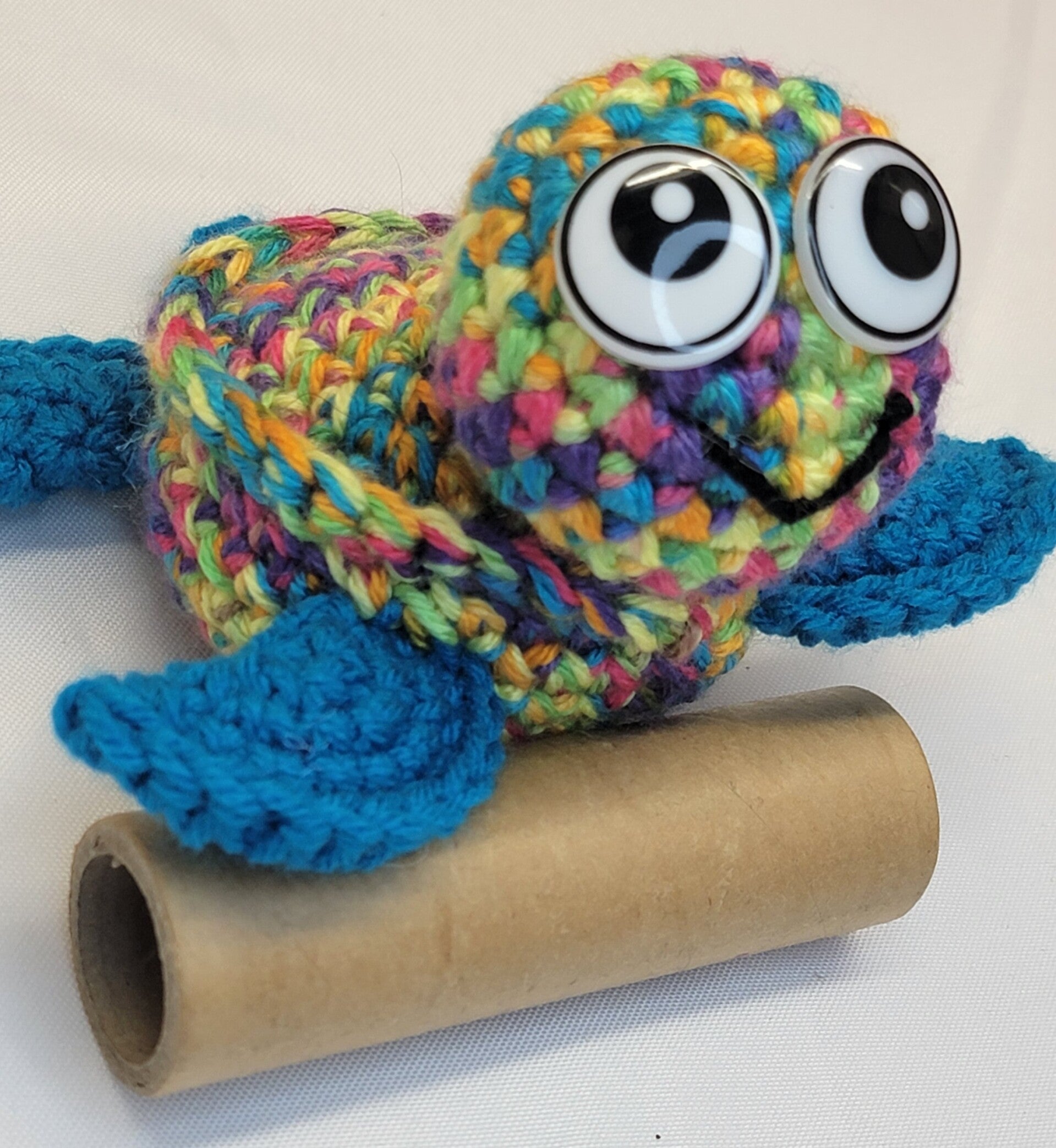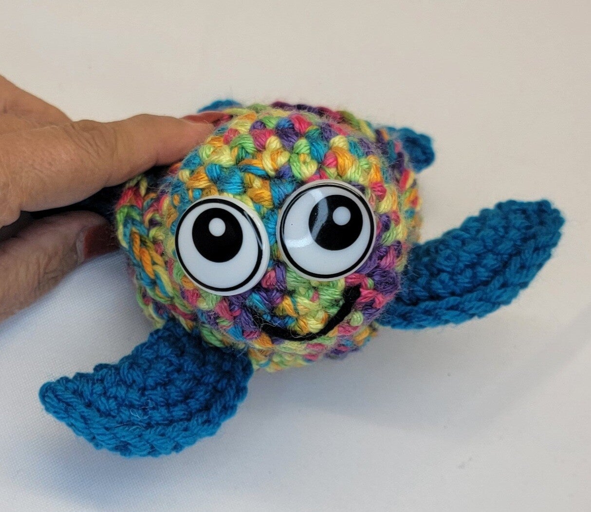 7" long brightly colored turtle with huge cartoon safety eyes and a big smile