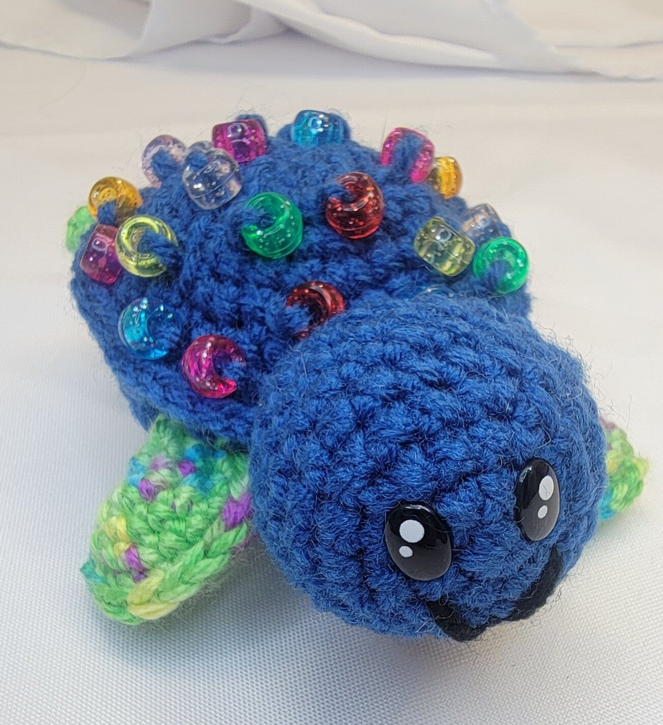6" long fidget turtle made with sparkly pony beads. Turtle is blue and neon green and purple cartoon safety eyes