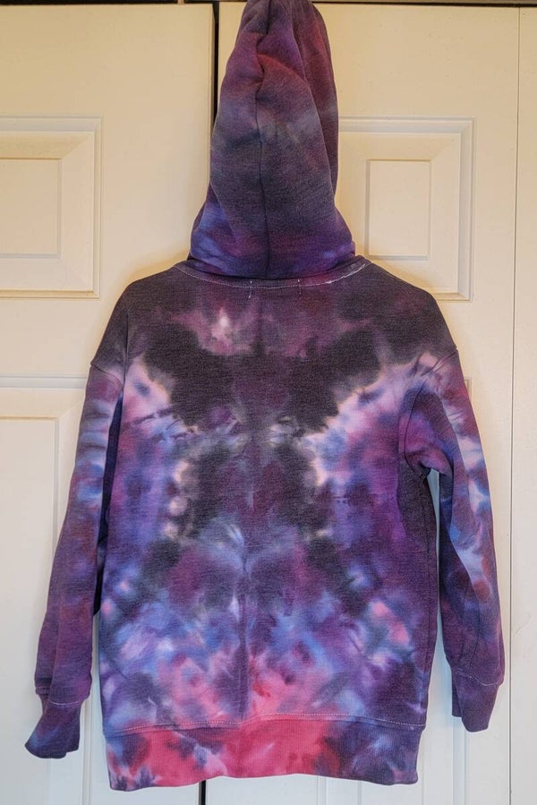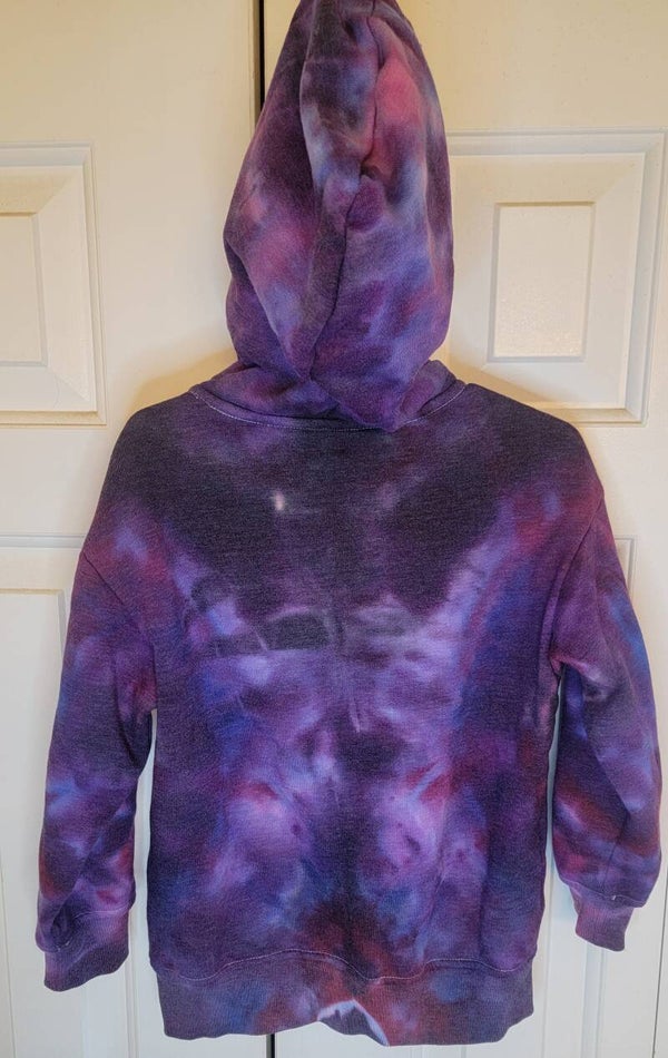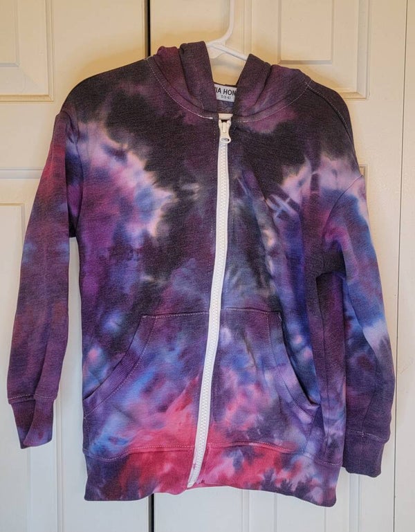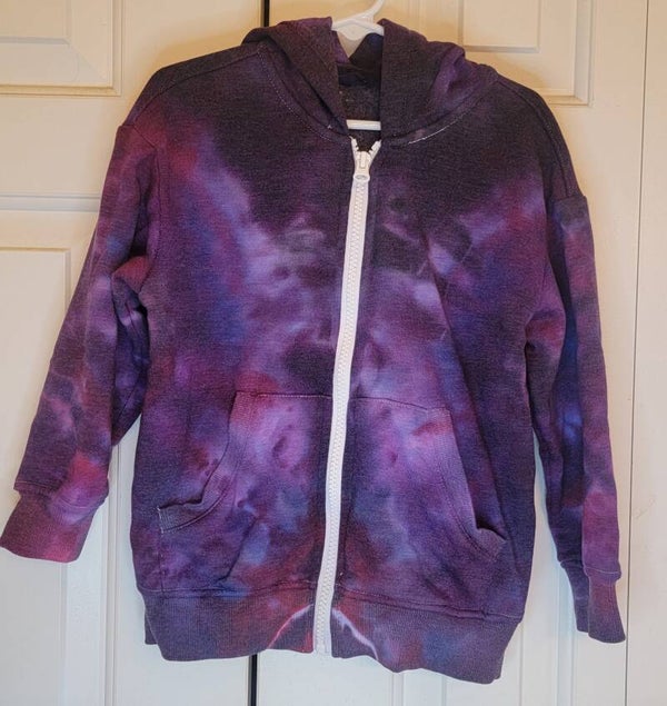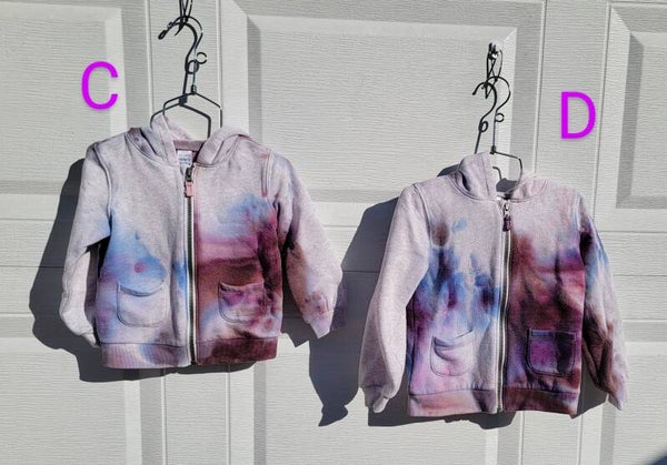 Long sleeved hooded cotton zippered sweatshirt dyed in pinks and purples