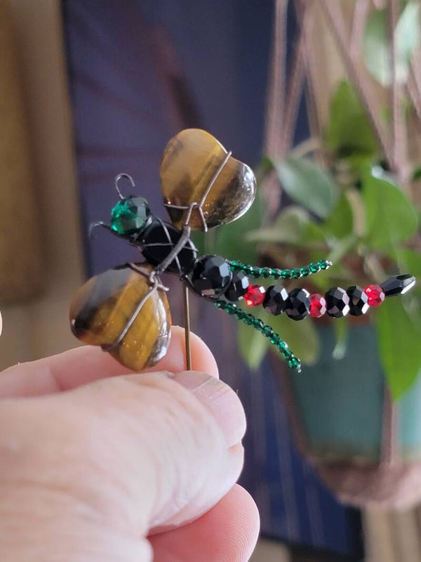 Dragonfly Brooch, Tigers Eye Cabochon, glass Beads and copper wrapped..