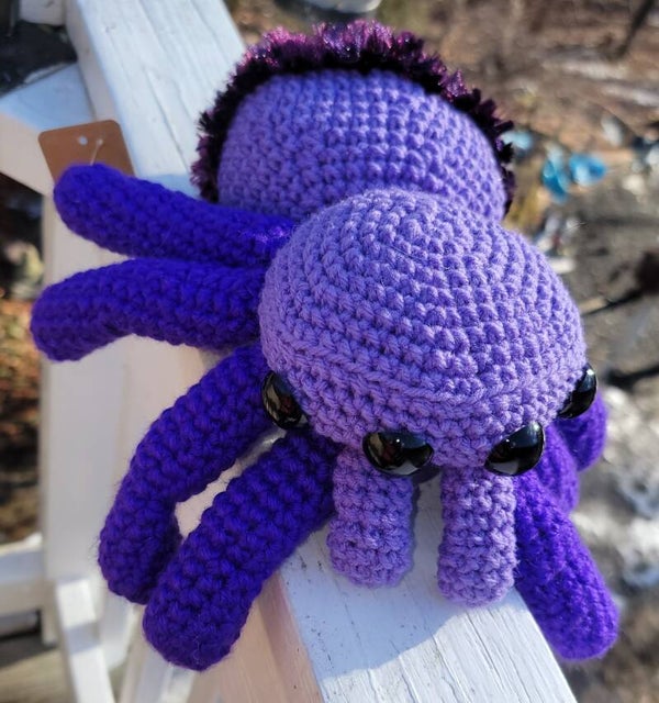 Purple 8 legged spider with black eyes. 11" long and 13" wide