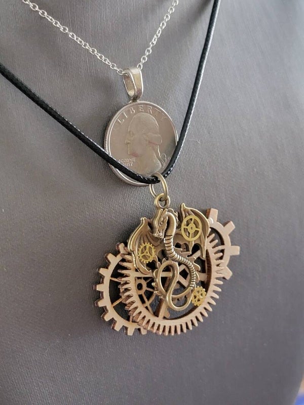 Wood and metal gears and silver hardware. Necklace is a sliding knot, ajastable from 16" to 30", no clasp. Necklace can be changed out for a chain or leather cord, color of your choice.