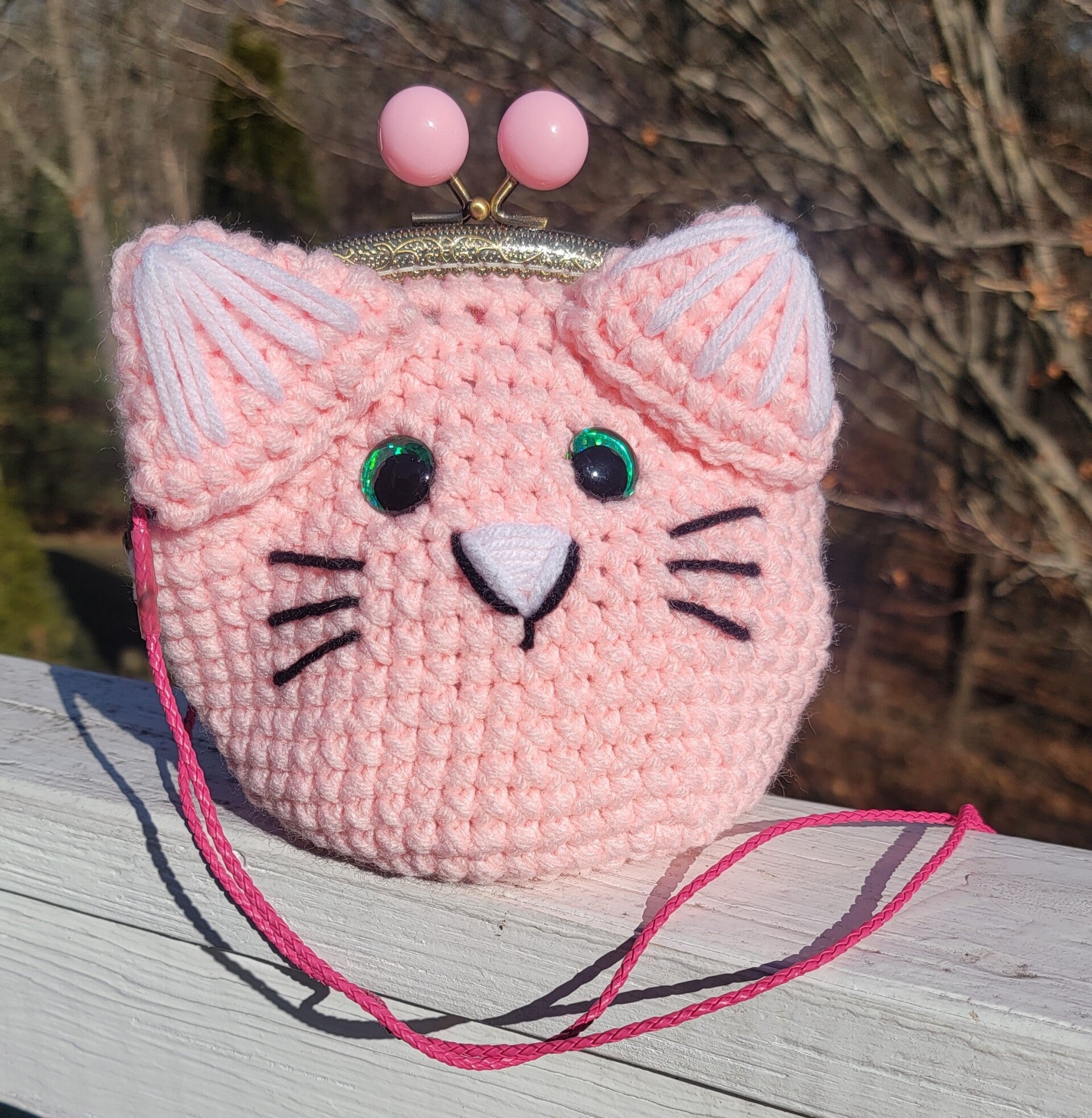 A. SOLD Pink kitty cat lined handbag. Green sparkly safety eyes. 7" tall and 7" wide.