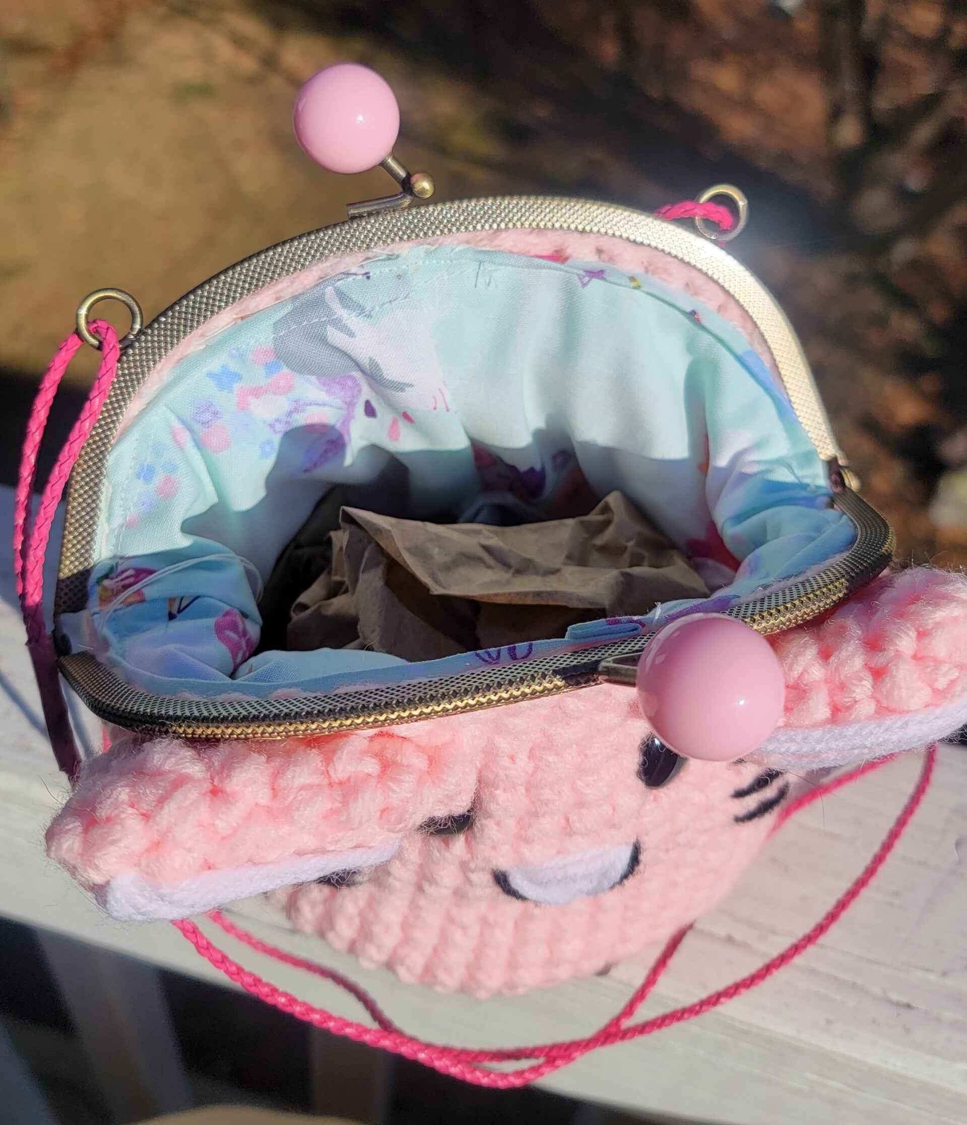 Pig handbag with a crossbody strap. Piggy tail on the back! Fully lined. 6" tall and 7" wide.