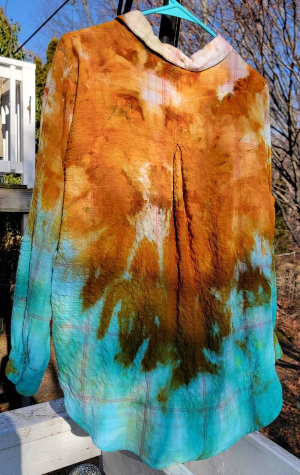 Jane and Delancy size Medium long sleeve plaid shirt with collar. Dyed in Curry Robin's Egg Blue and aqua