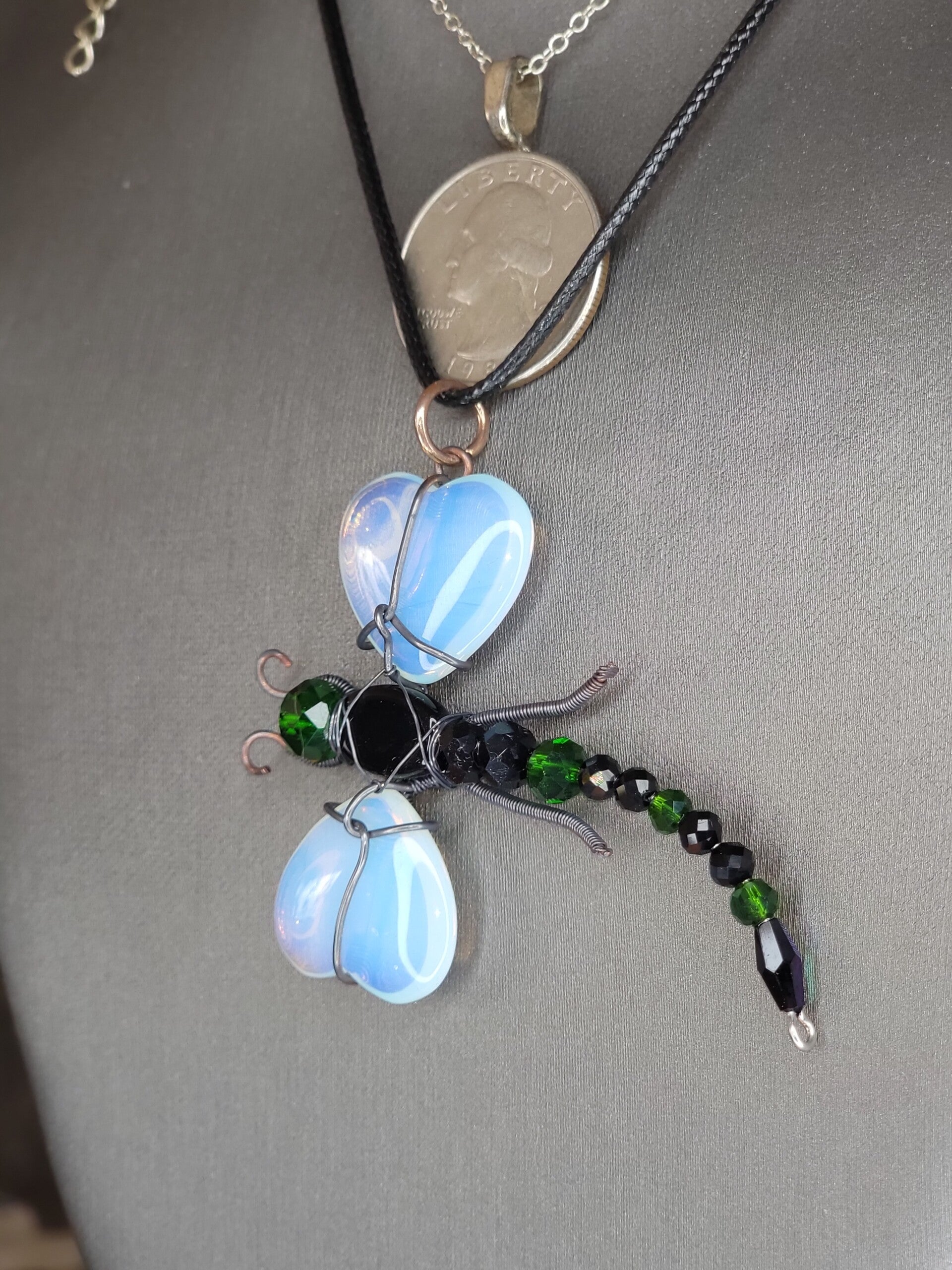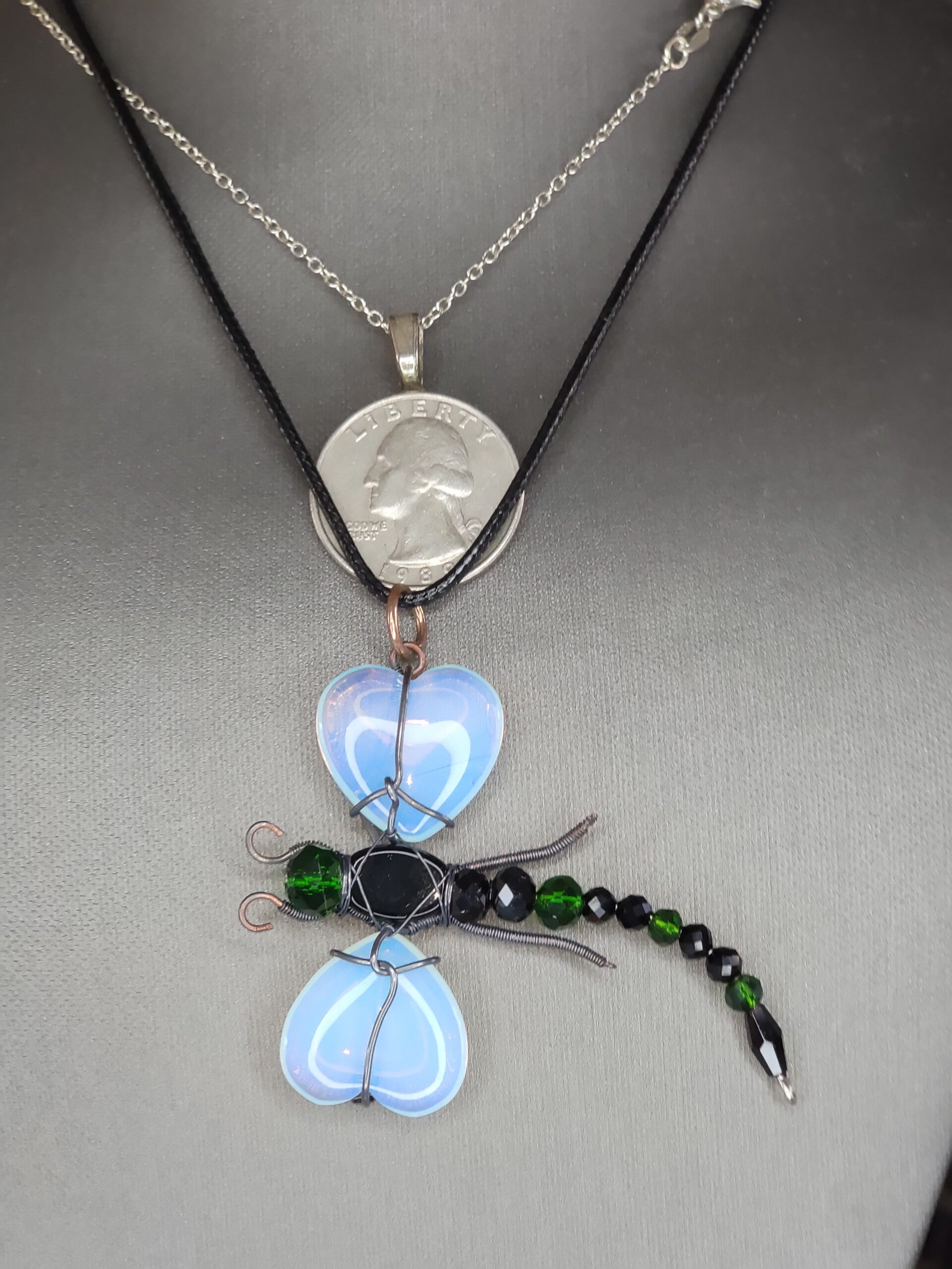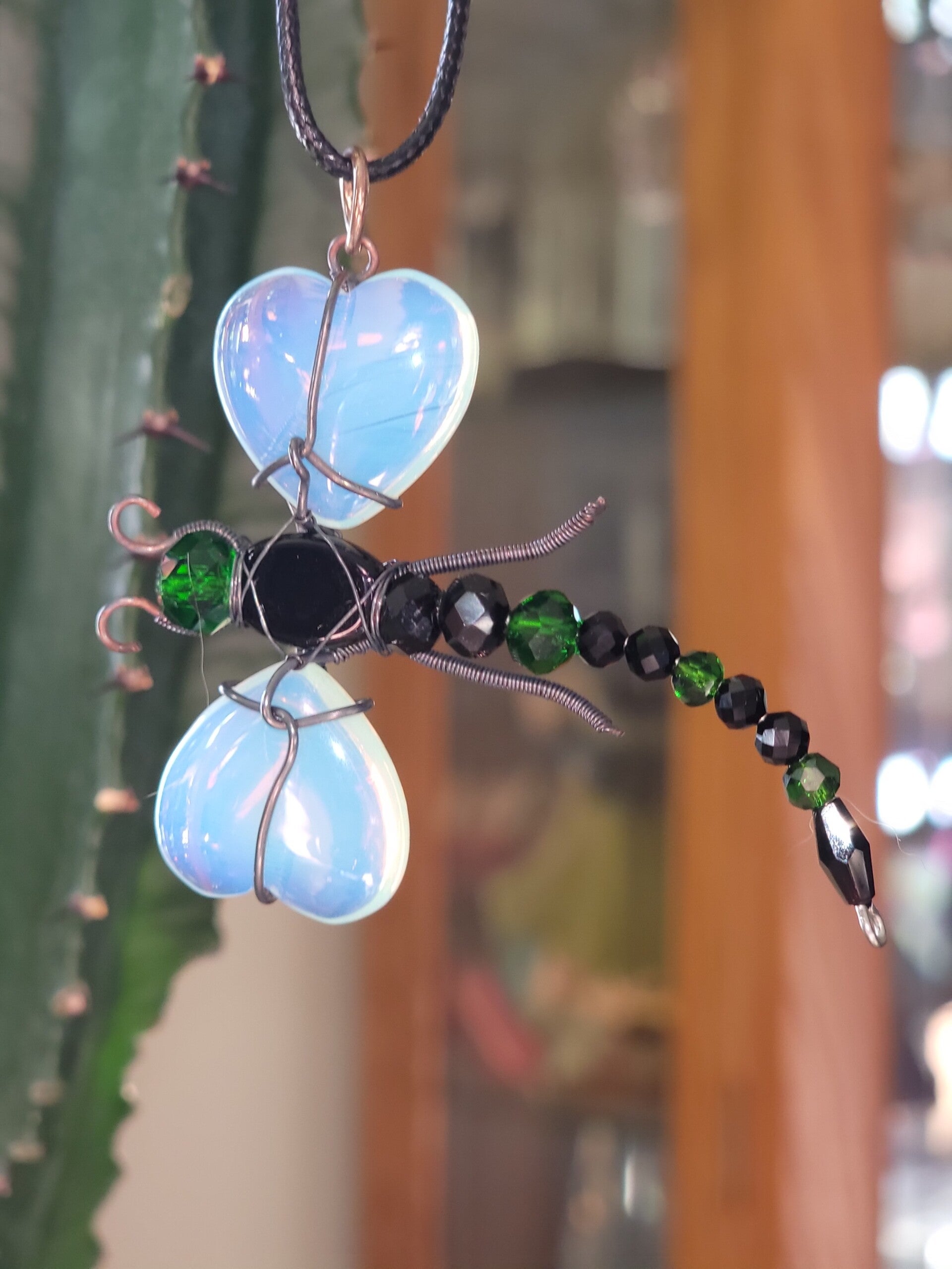 Necklace & Dragonfly Pendant, 2 Opalite Heart shaped Cabochons, glass Beads and copper wrapped..