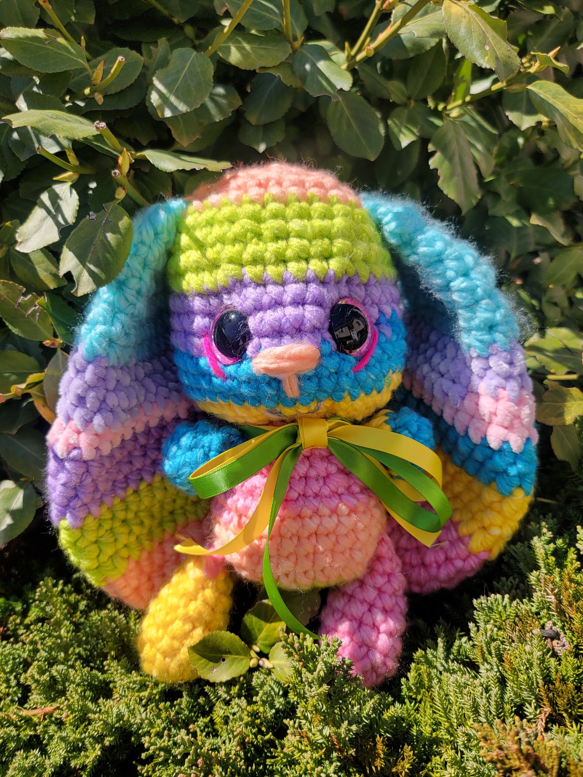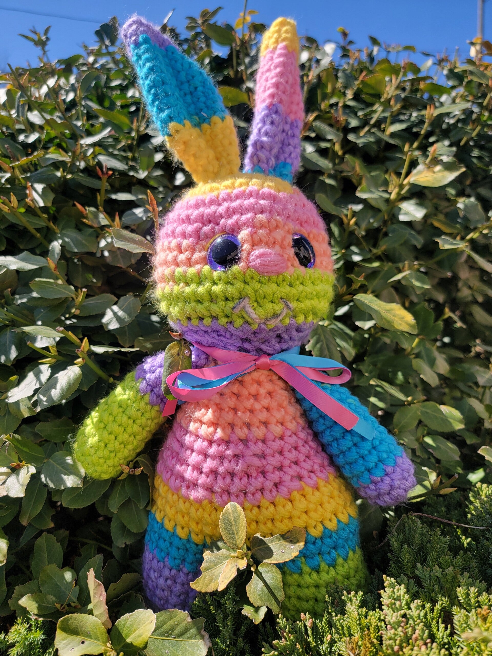 B. 10" tall with ears that envelope the entire bunny. Bright pastel colors. Big pink sparkly safety eyes