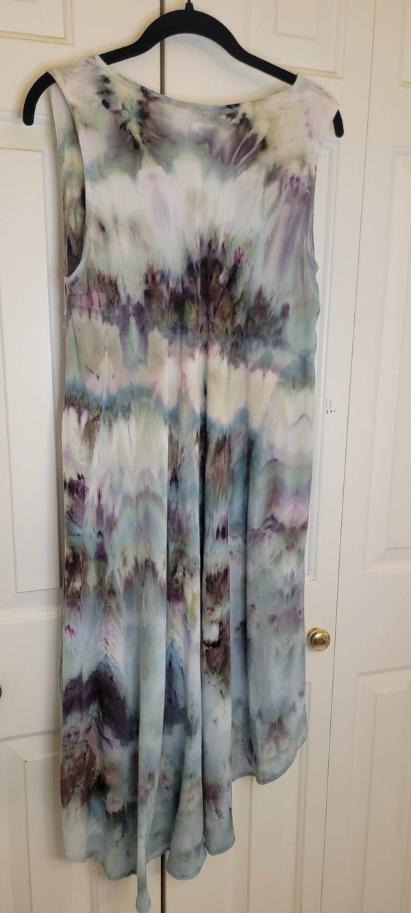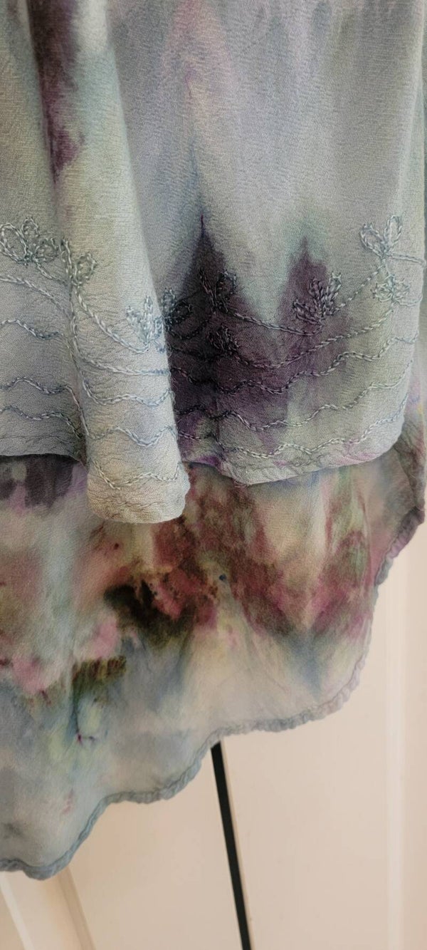 Island Fantasy 100% Rayon cover up fits sizes S M and Large. Scoop hem longer in the back then the front. Lace border. Dyed in Moonstone