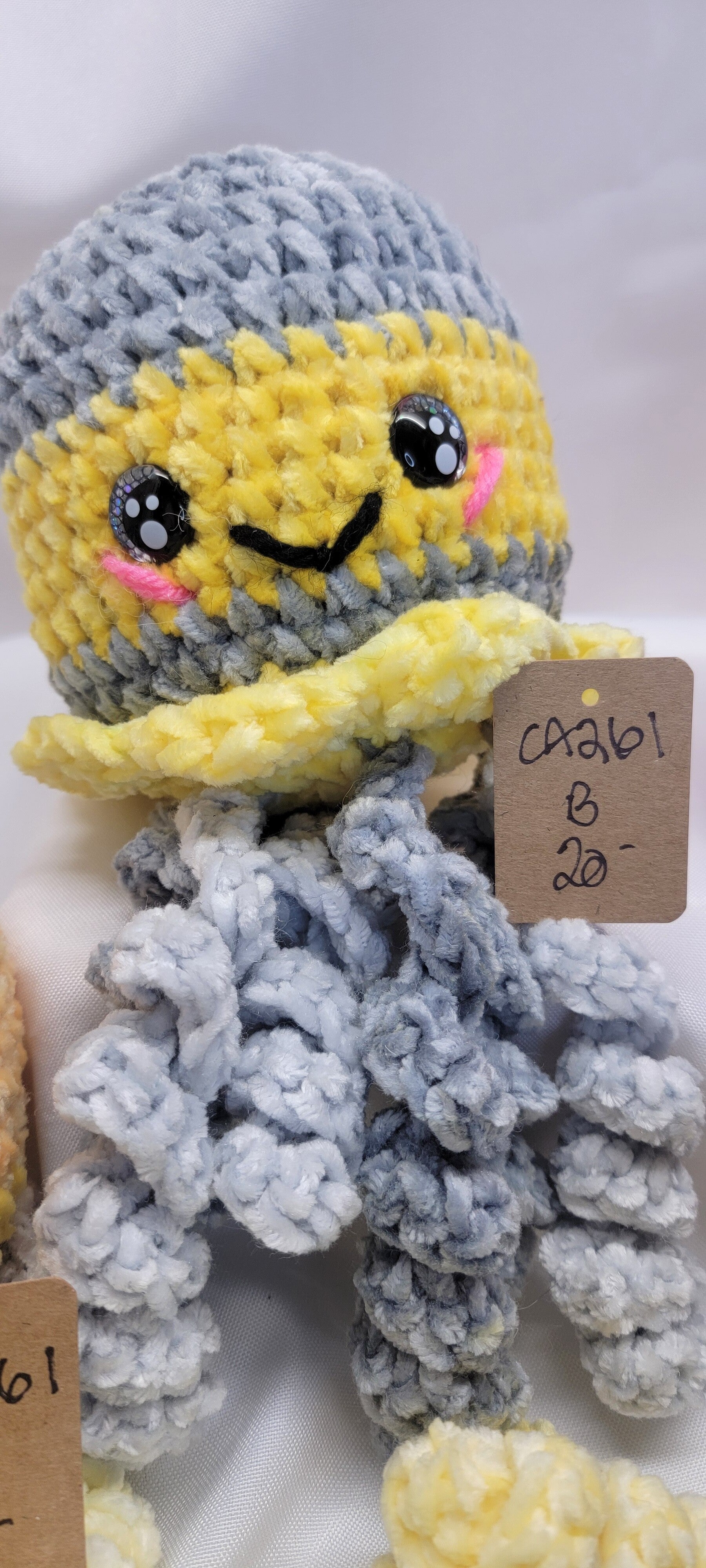 6 different colored Octopus in velvet yarn. Super soft and squishy. Safety eyes used. Long curly tentacles. Order by letter #