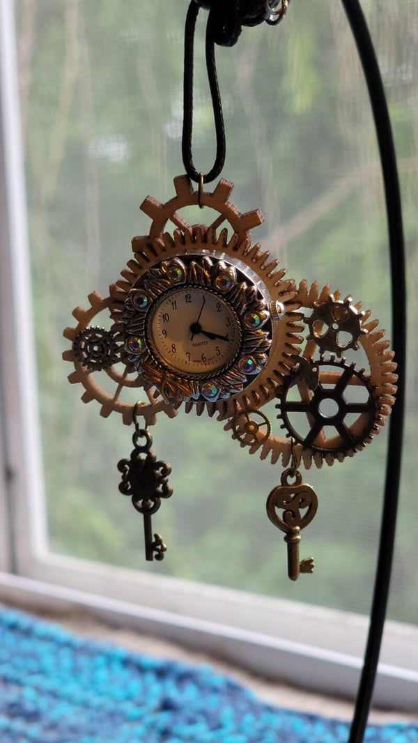 Wood and metal gears and silver hardware. Necklace can be changed out for a chain or leather cord, color of your choice.