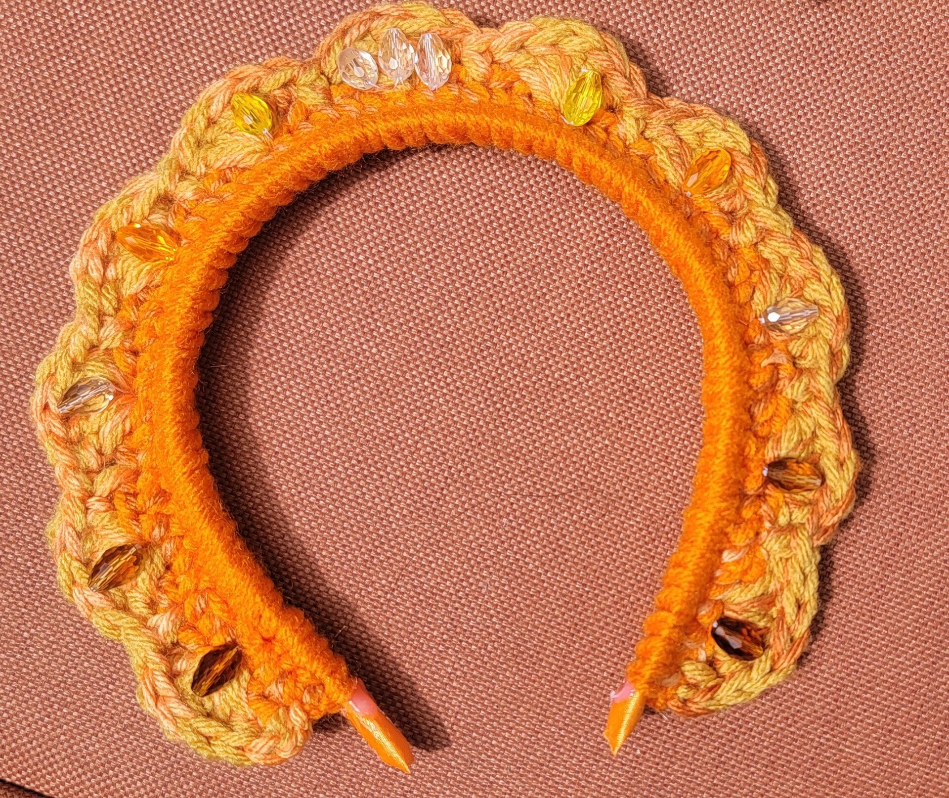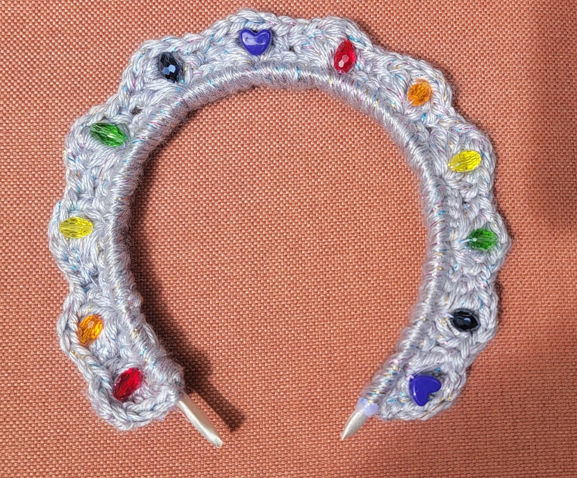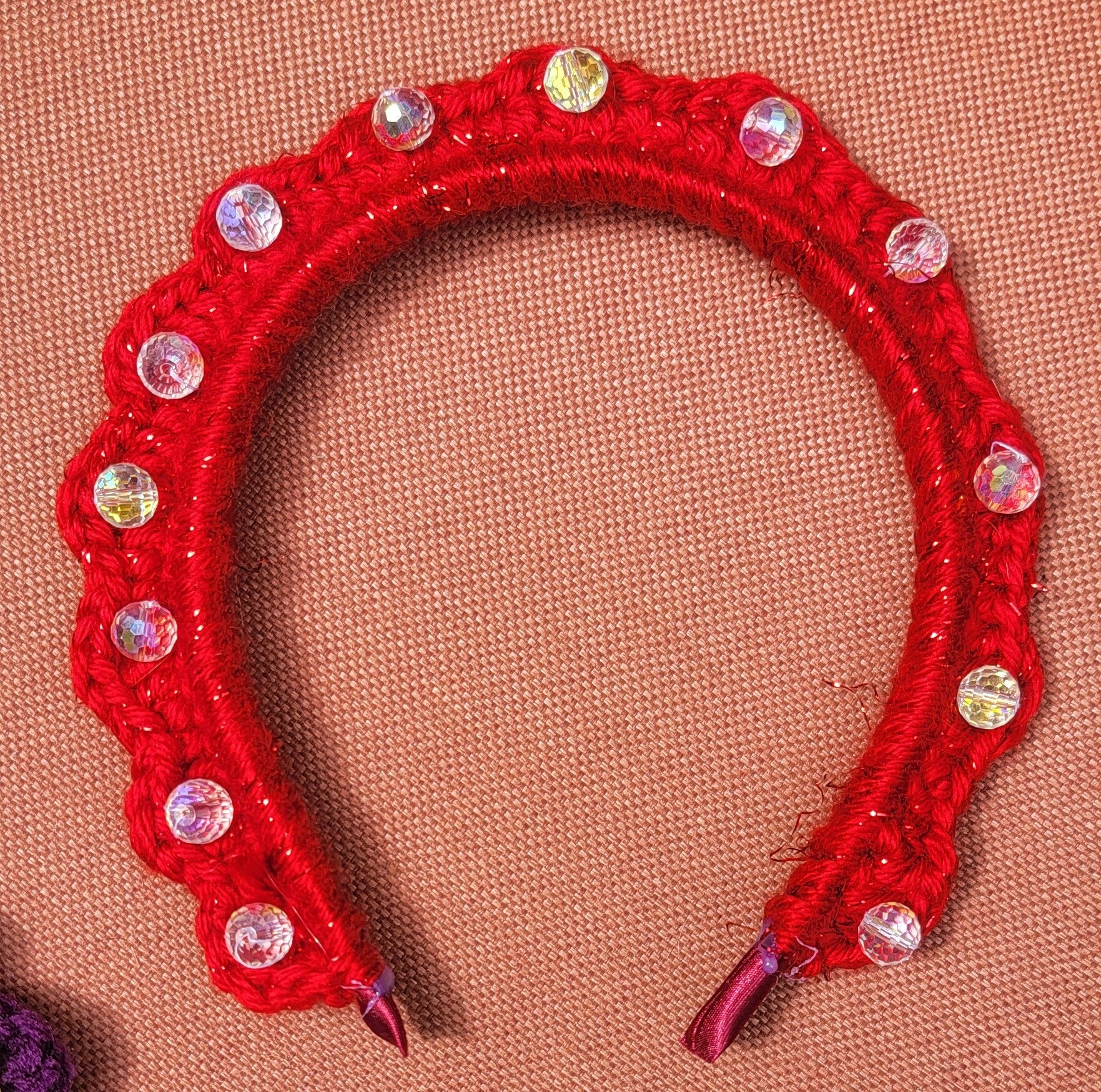 Satin padded wired headband with a crocheted border accented with beads and crystals