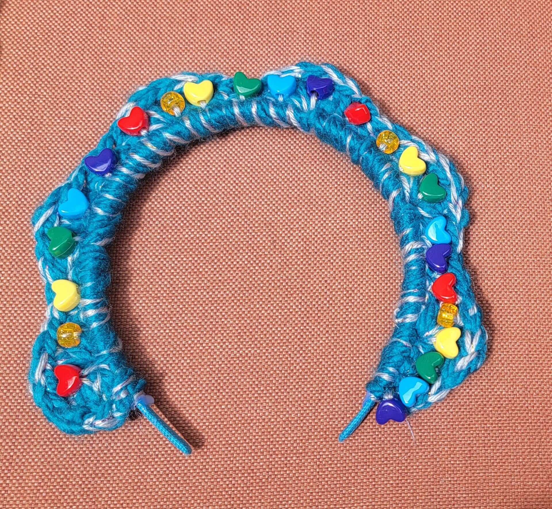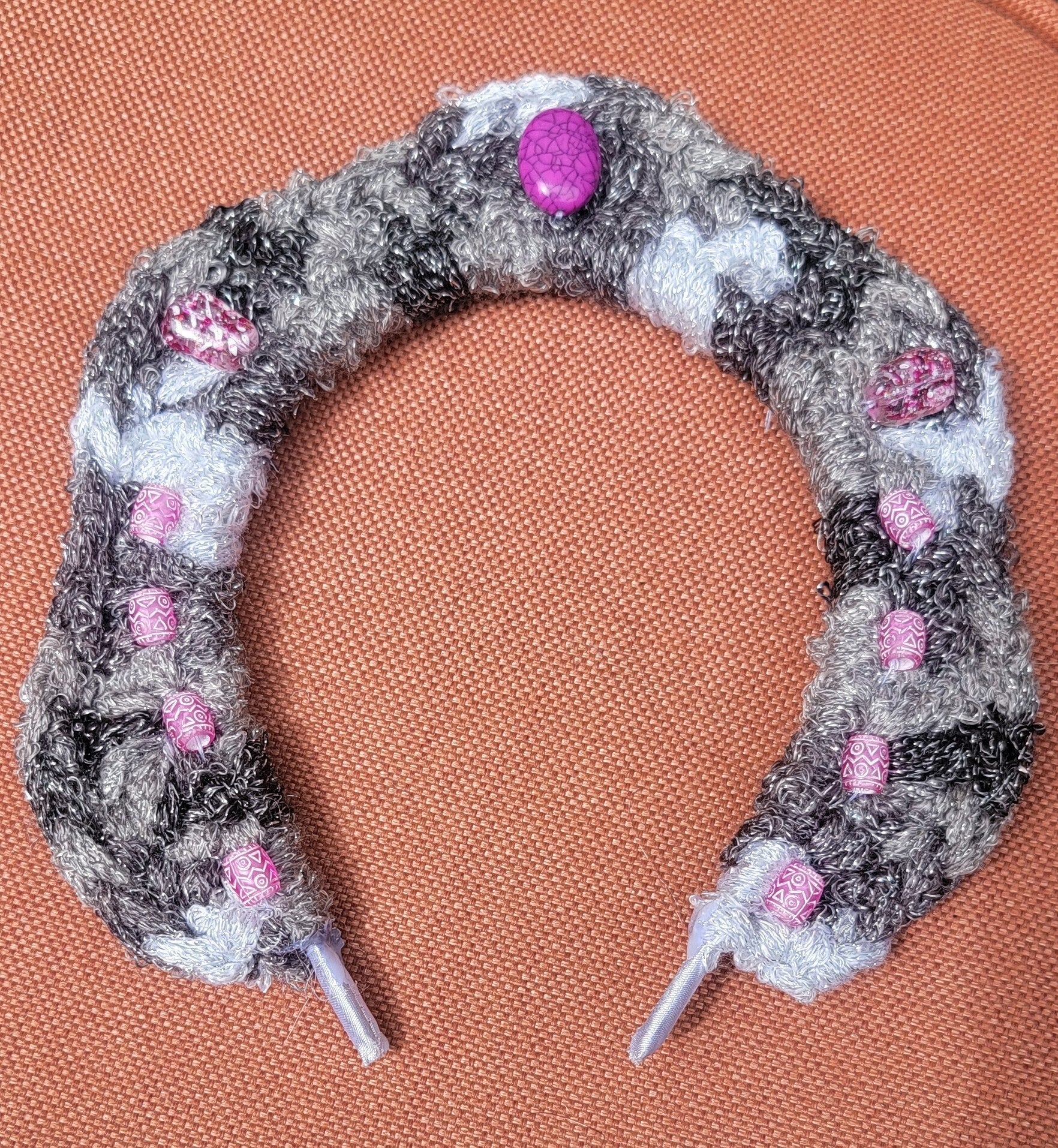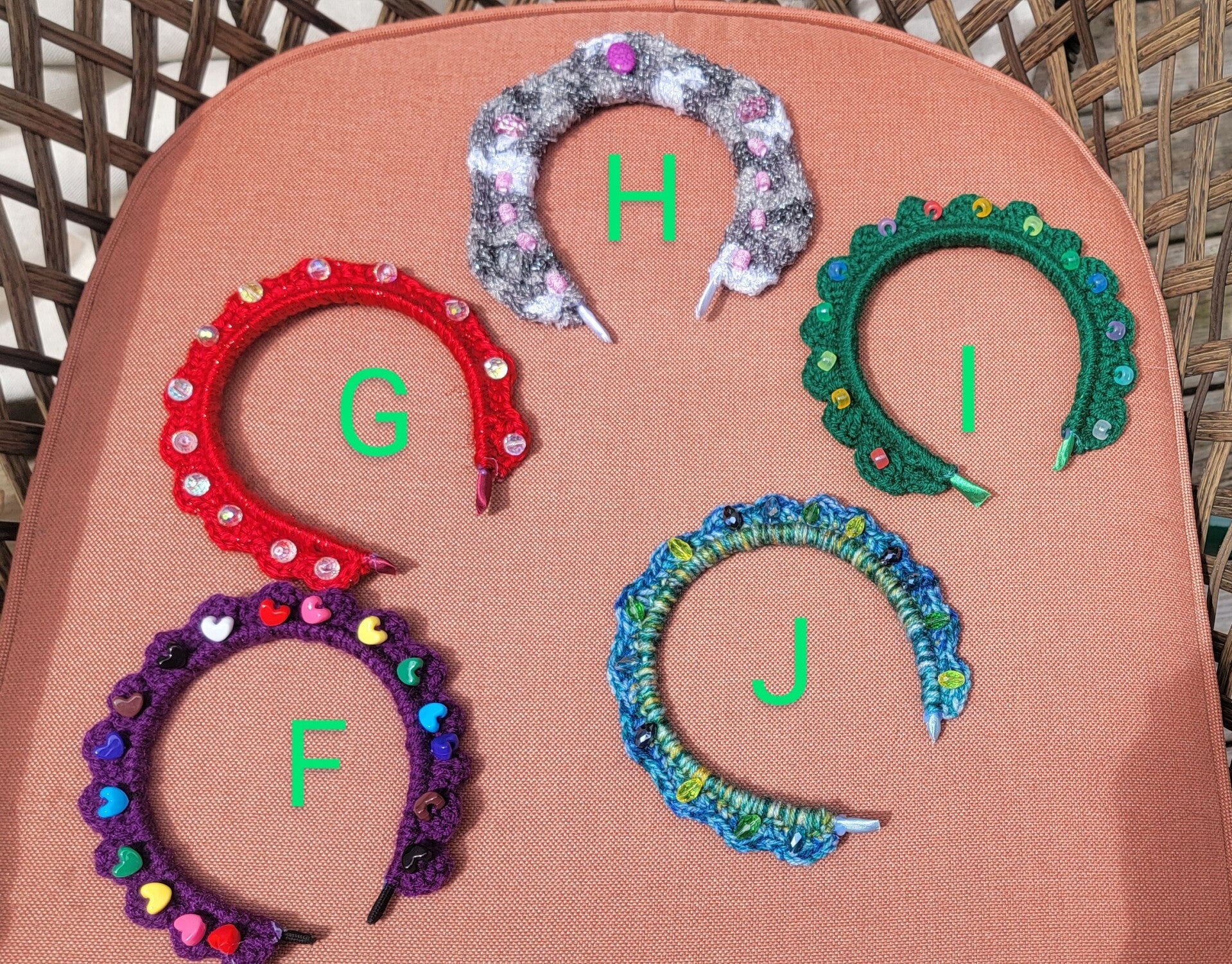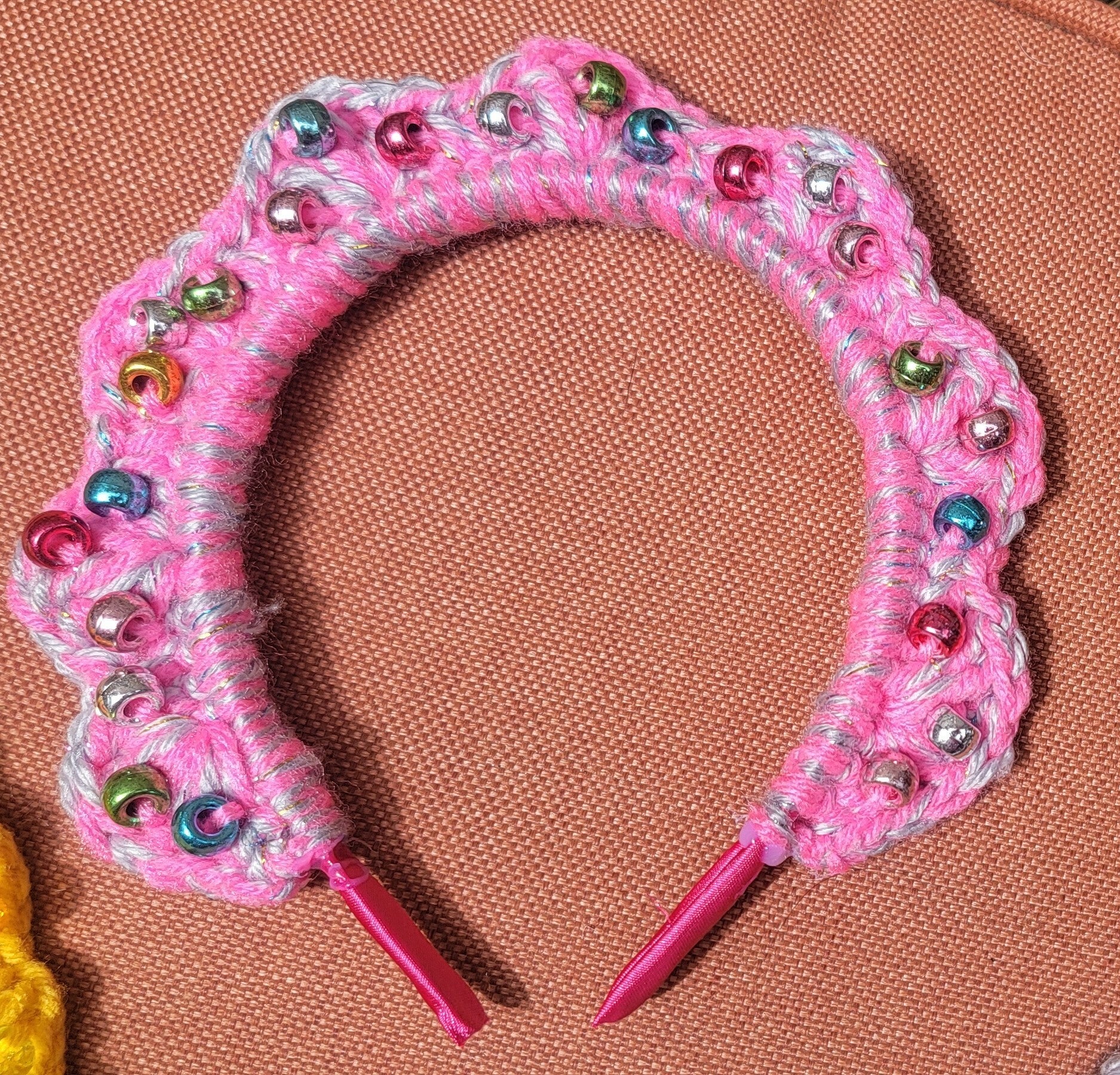 Satin padded wired headband with a crocheted border accented with beads and crystals