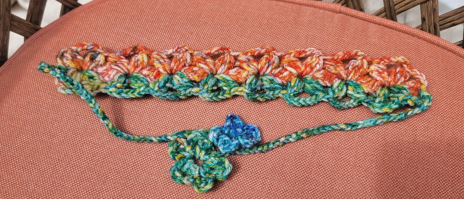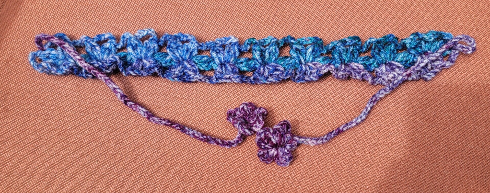 Crocheted headband in flowers with flower end ties