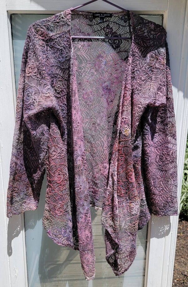 Cable and Gauge long sleeved lace waist high kimono. Beautiful shades of blue green blue and purple.
