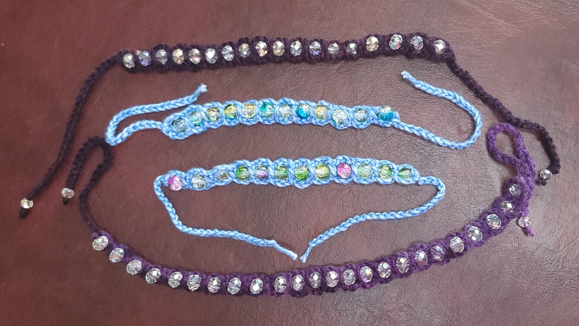 Crystal beads crocheted onto cotton yarn.