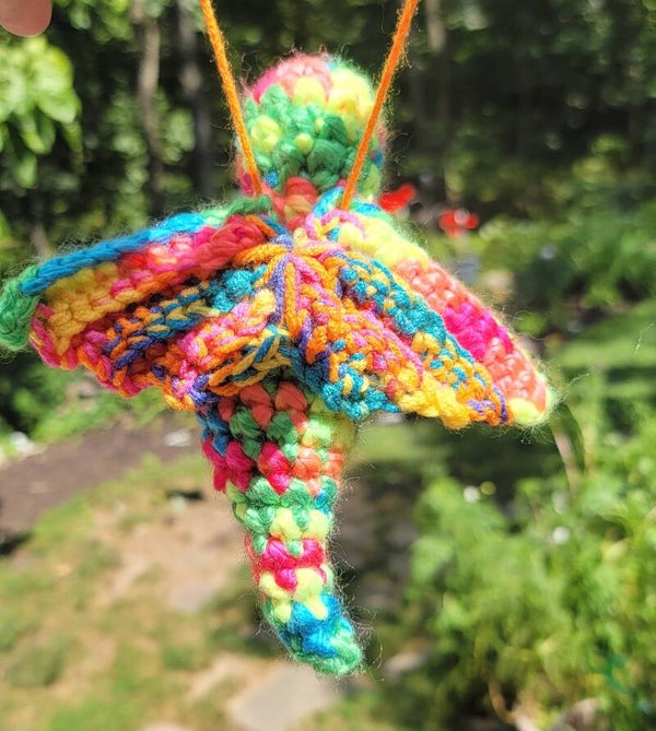 Bright bulky yarn makes a 7.5" long hummingbird!