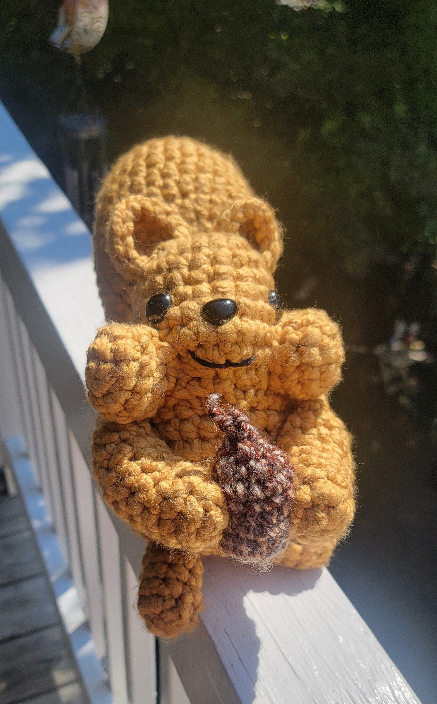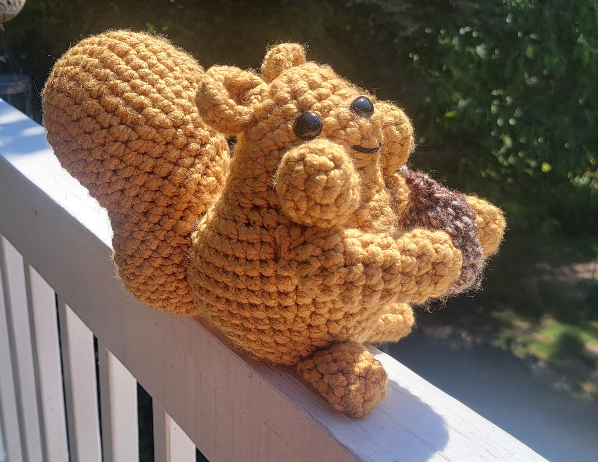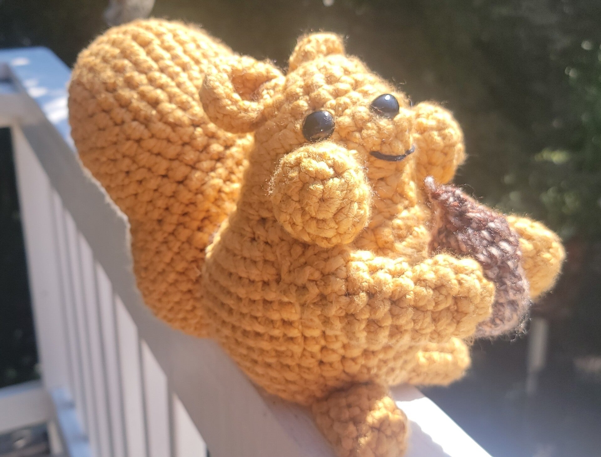 8" tall and 12" long squirrel in gold bulky yarn with black safety eyes and an acorn