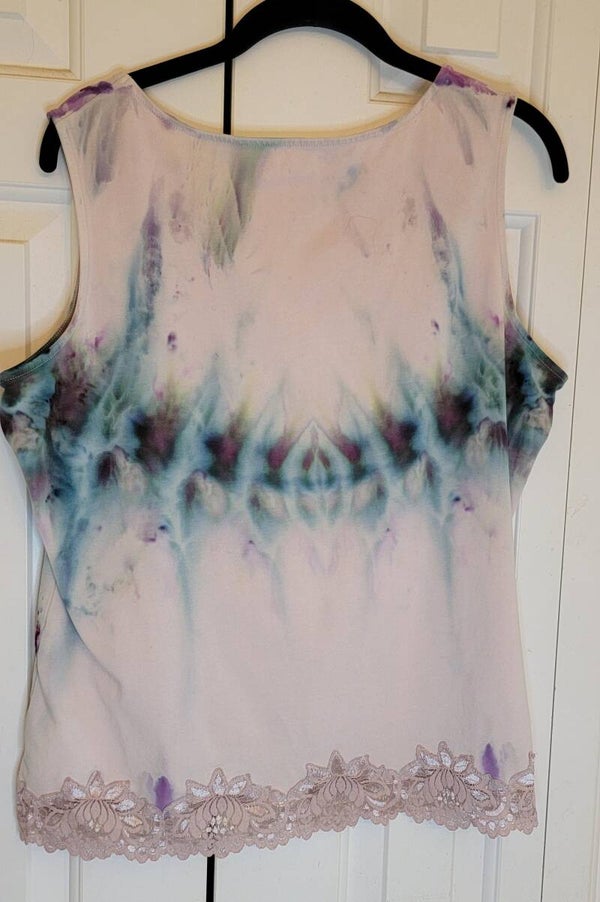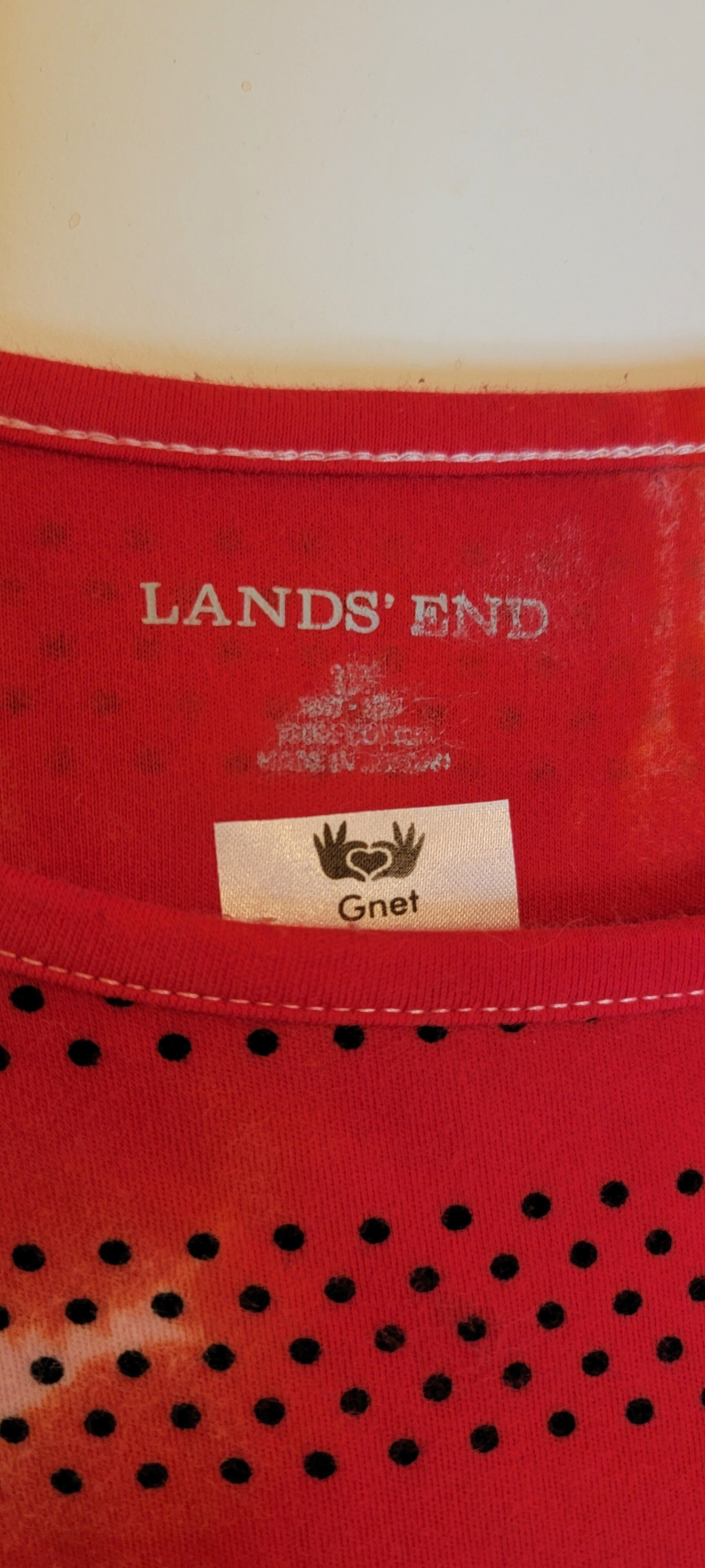 A Lands End with red dye on a white and blue dots 1X tank top