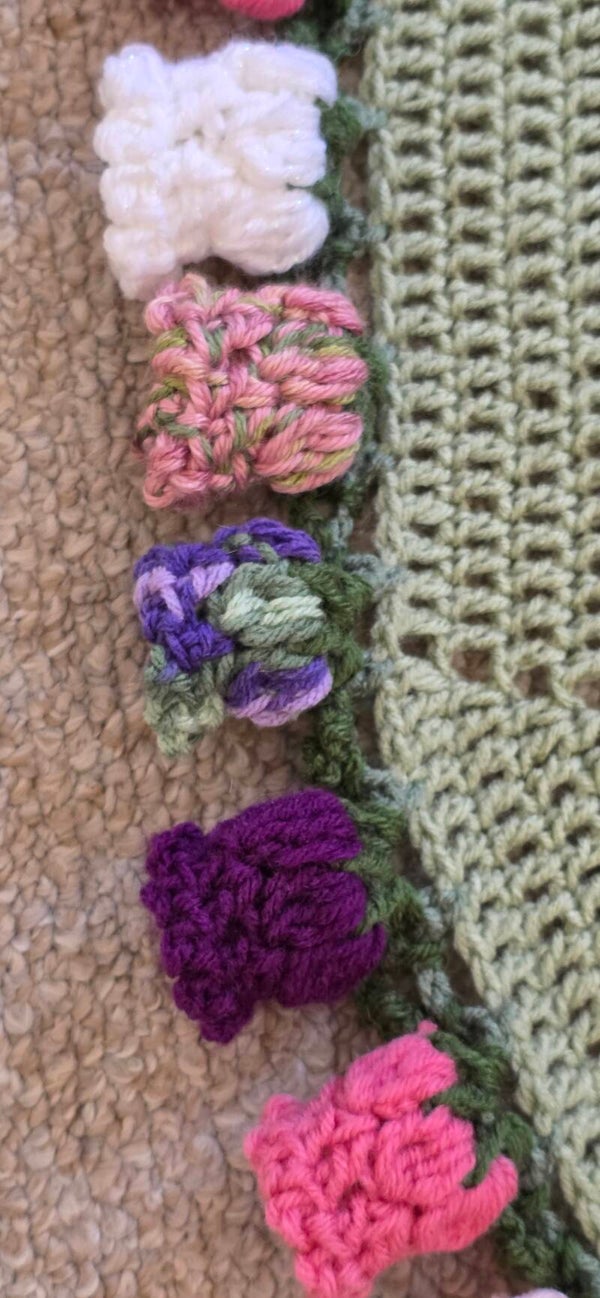 55" circular blanket with Lily of the Valley flowers in various colors on the edges. When the blanket is picked up in the middle, the blanket turns into a bouquet of flowers!