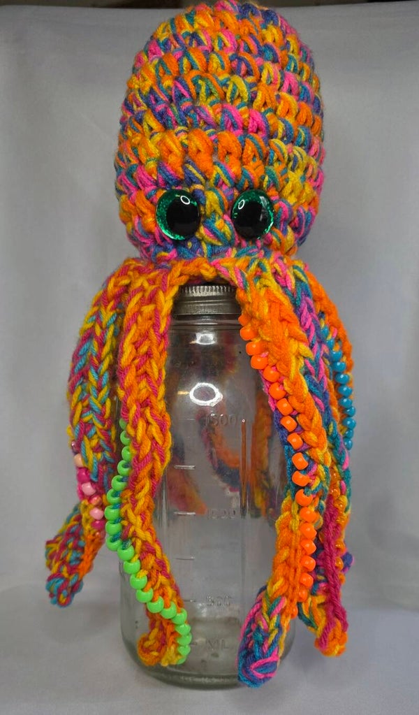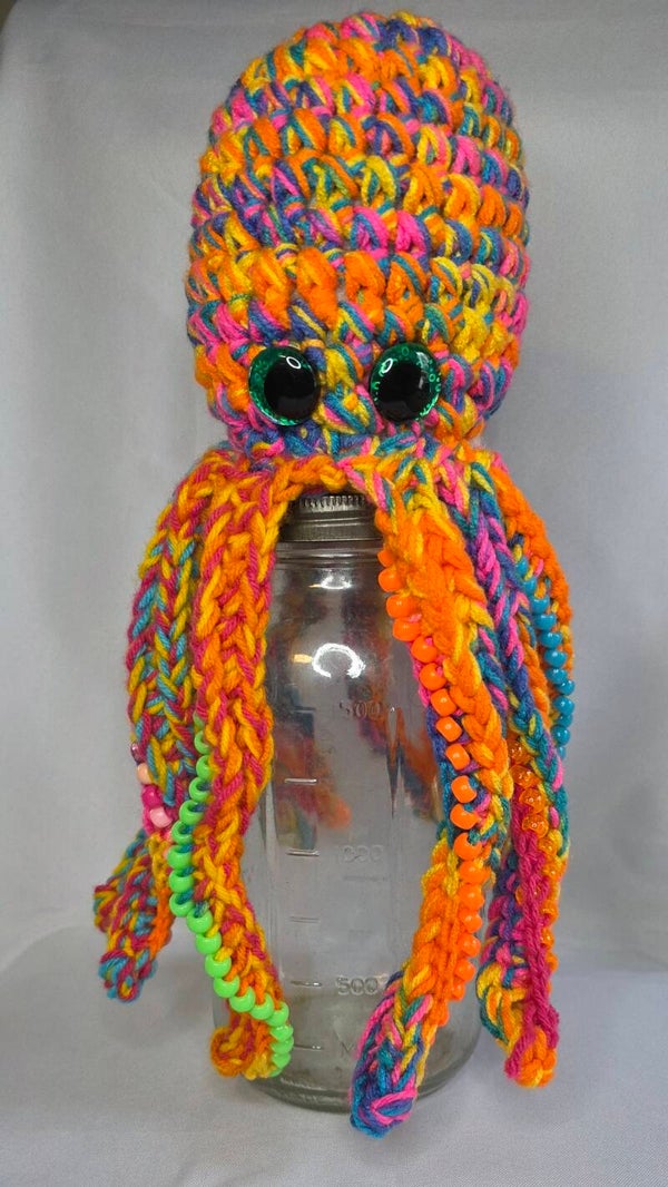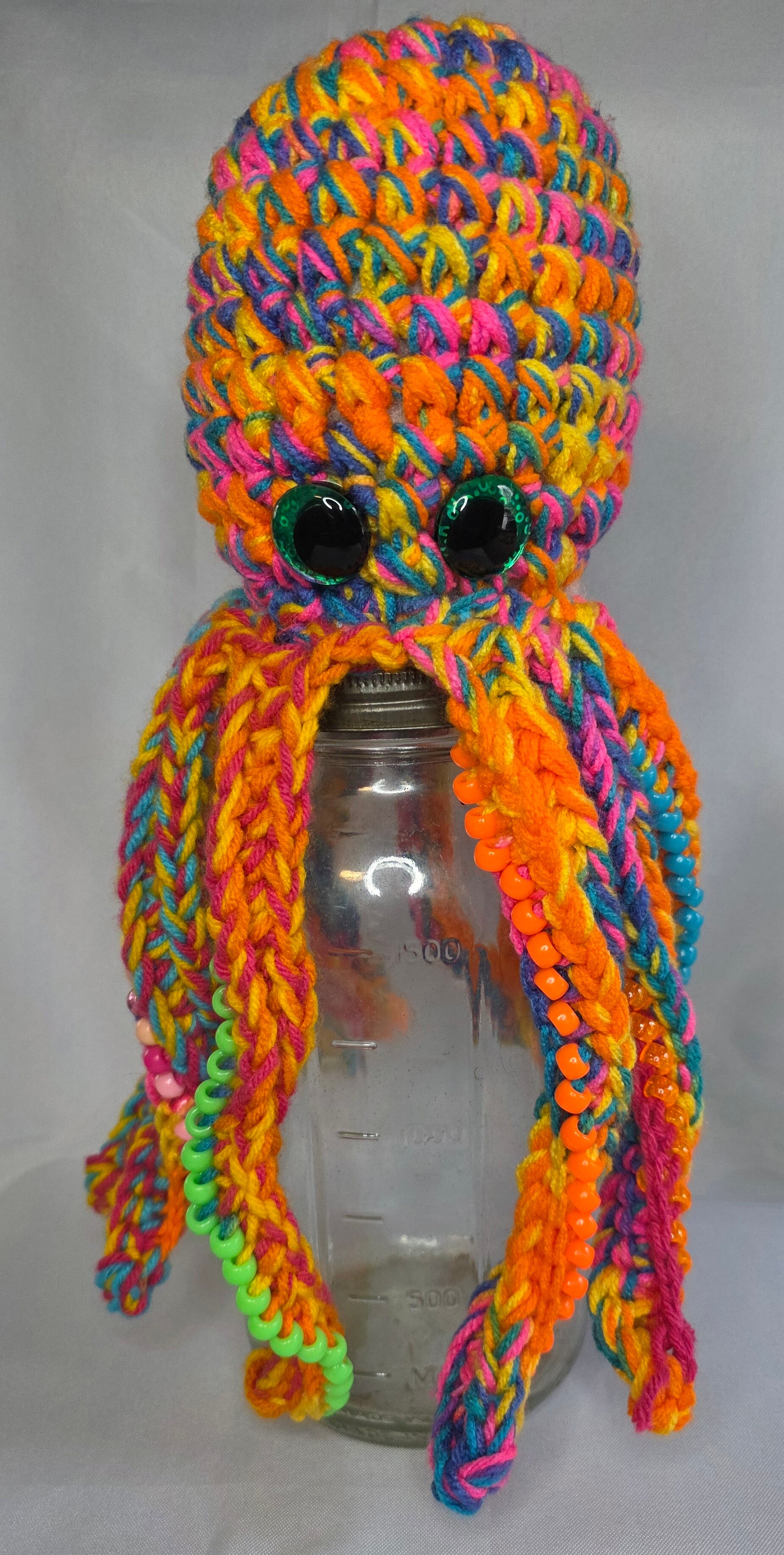 14" tall Octopus with vibrant neon colored acrylic yarn. Large green sparkly safety eyes. 11 tentacles with pony beads as fidgets.